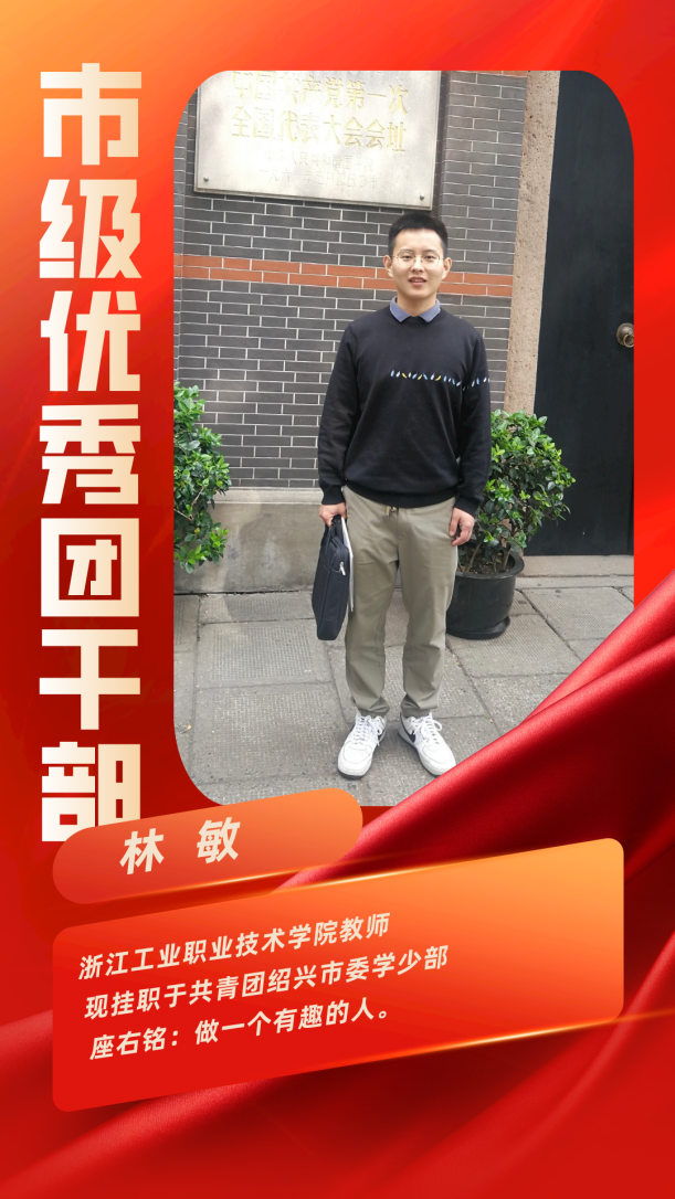 林敏,中共党员,财经学院教师,现挂职于共青团绍兴市委学少部。曾指导财经学院17会计1团支部荣获2019年度“浙江省千强团支部”荣誉称号先后指导团队荣获全国“镜头中的三下乡”优秀报道奖全国“千校千项”优秀团队奖、“绍兴市大中学生暑期社会实践优秀团队”挂职期间,带队参加浙江省“红领巾学院”思政微队课大赛获优秀组织奖,配合市新闻传媒中心圆满完成团中央、青少总社主导的青少年庆祝建党100周年系列视频录制工作,牵头组织开展“青春的模样”主题绍兴市大中学校社团嘉年华绍兴市“家燕归巢”大学生暑期社会实践等数项活动