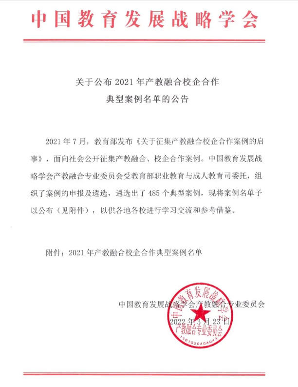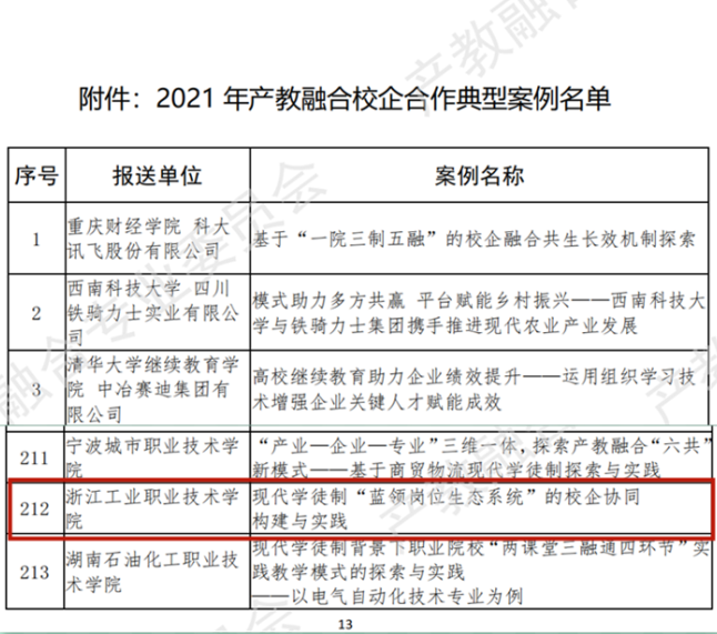 近日,教育部发布“2021年产教融合校企合作典型案例名单”,我校产教融合处协同机电工程学院报送的《现代学徒制“蓝领岗位生态系统”的校企协同构建与实践》案例成功入选。