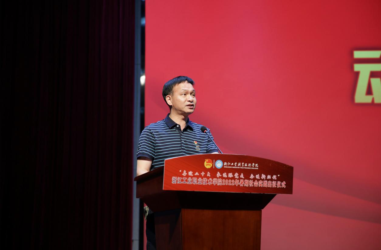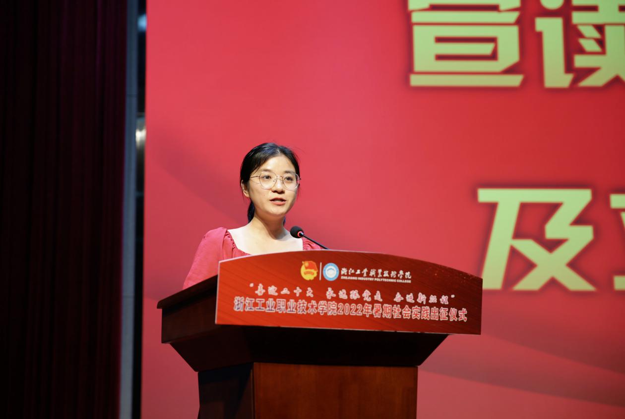 仪式在全体人员奏唱国歌中拉开帷幕。袁桃宣读了2022年暑期社会实践活动方案及立项团队名单。今年我校社会实践将紧紧围绕“守好红色根脉·助力共同富裕”主题,聚焦理论普及宣传、党史学习教育、乡村振兴促进、发展成就观察、共同富裕实践等10个重点方向,集中组队和分散实践相结合、个人与团队相结合、线上与线下相结合等方式开展
