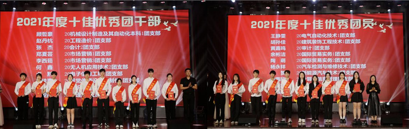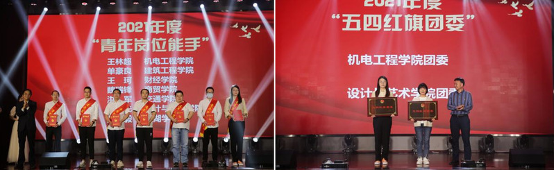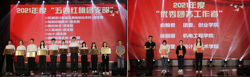 与会学校领导分别对2021年度全校共青团工作中涌现出的优秀集体和先进个人进行表彰颁奖。机电工程学院团委、设计与艺术学院团委荣获“五四红旗团委”荣誉称号;20机械设计制造及其自动化本科1班团支部等10个团支部荣获“五四红旗团支部”荣誉称号;陈昌蜜等236名团员荣获“优秀团员”荣誉称号;曹浩东等110名团干部荣获“优秀团干部”荣誉称号;王静雯等10名团员荣获“十佳优秀团员”荣誉称号;顾哲豪等10名团干部荣获“十佳优秀团干部”荣誉称号;俞翰君等3名教师荣获“优秀团务工作者”荣誉称号;王林超等7名教师荣获“青年岗位能手”荣誉称号;盛国栋、徐逸昕、机制双创教学团队、财经学院青年志愿者协会荣获“青年五四奖章”荣誉称号。
