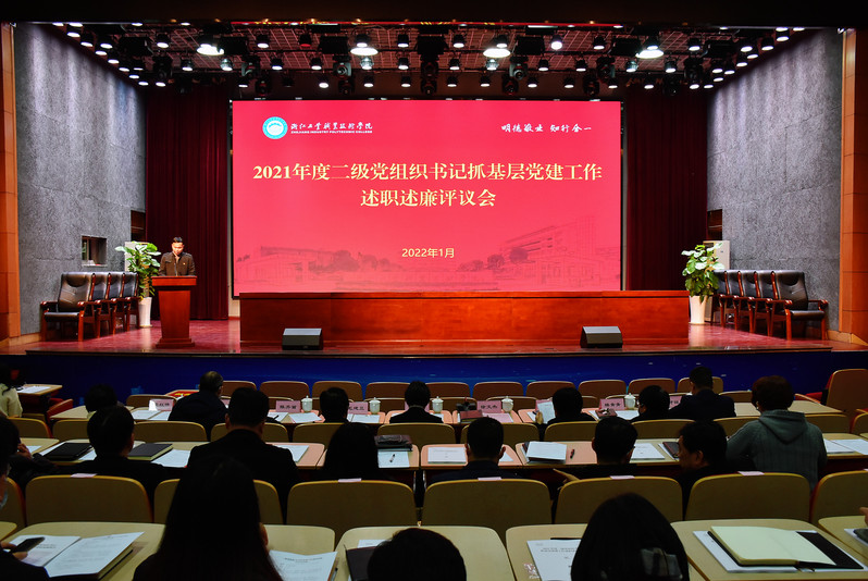会议现场12位二级党组织书记就抓基层党建工作进行述职述廉,其他二级党组织书记以书面方式进行。参会人员对全校26个二级党组织书记2021年度抓基层党建工作进行了民主评议。
