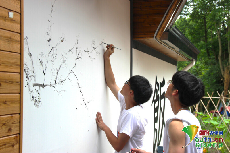 图为实践团队在当地农家小院中对白墙进行创作绘画。