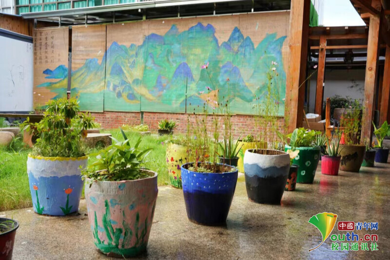 图为实践团队在当地农家小院中对盆栽进行创作绘画。