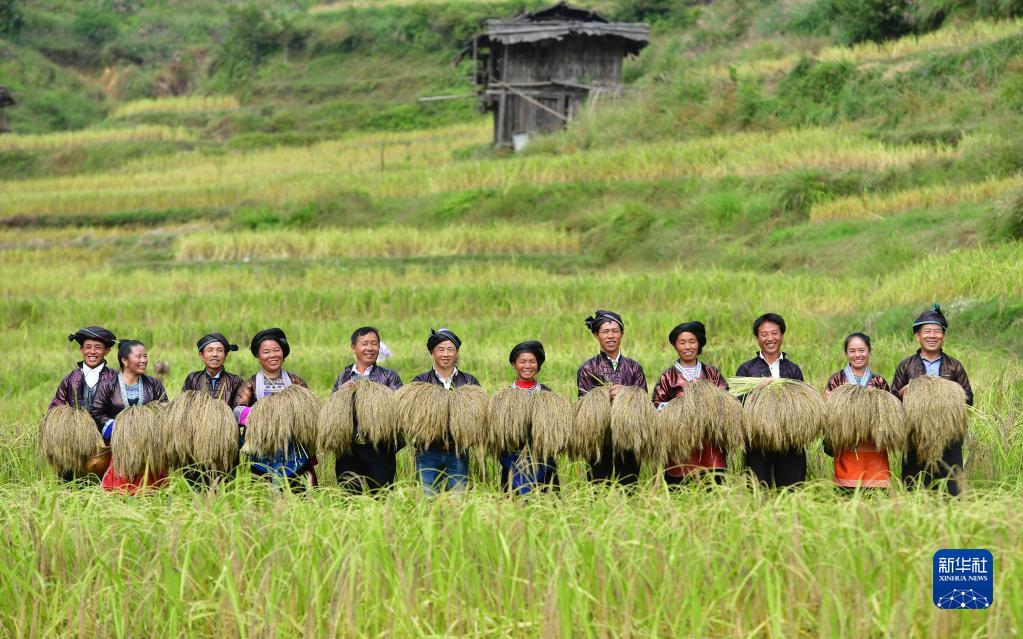 在广西融水苗族自治县良寨乡大里村,村民们展示刚刚收割的脱贫特色产品——紫黑香糯(2018年10月12日摄)。 新华社记者 黄孝邦 摄