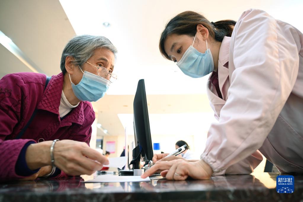 福建省三明市第一医院的医保办工作人员(右)向前来咨询药品报销问题的居民讲解相关政策(2020年11月18日摄)。 新华社记者 姜克红 摄