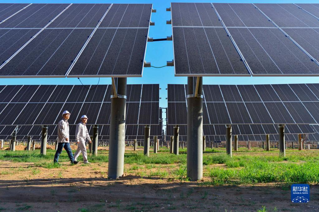 工作人员在内蒙古自治区鄂尔多斯市伊金霍洛旗天骄绿能50万千瓦采煤沉陷区生态治理光伏发电示范项目区里巡查(2021年7月8日摄)。 新华社发(王正 摄)