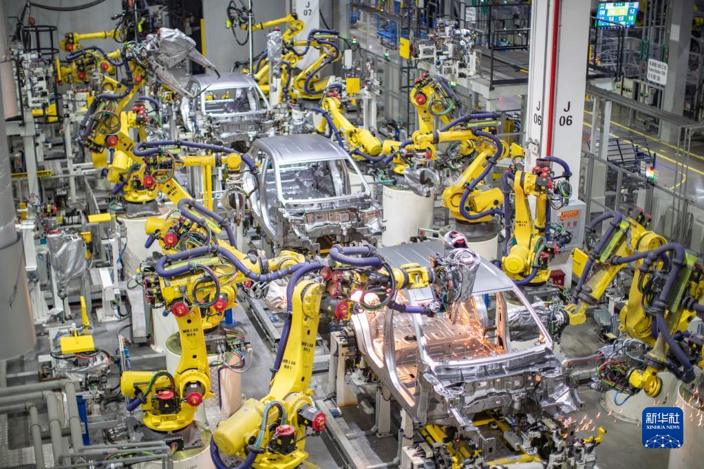 重庆一家新能源汽车企业使用智能化焊接机器人进行焊接作业(2021年4月2日摄)。 新华社记者 黄伟 摄