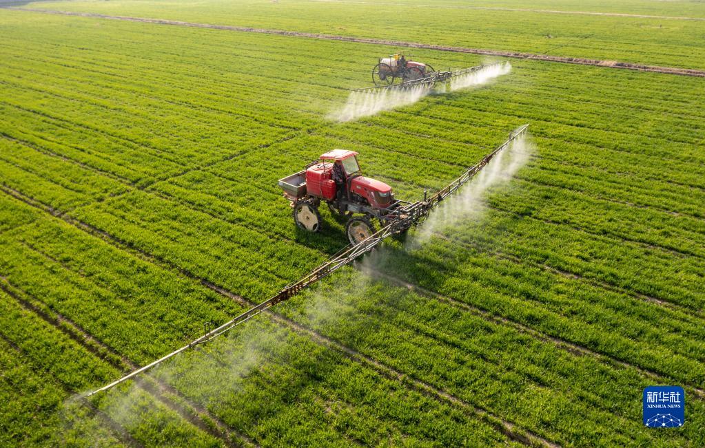 2022年3月9日,在江苏省海安市大公镇贲集村,村民驾驶植保机械在小麦田间进行喷洒药物作业(无人机照片)。 新华社发(翟慧勇 摄)